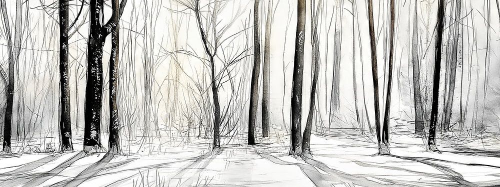 Een indrukwekkend zwart-wit schilderij van een verstild winterbos, waarin de schaduwen van de kale bomen over de ongerepte sneeuw dansen. Het contrasterende spel van licht en donker benadrukt de heldere, scherpe lijnen van de boomstammen en versterkt de stilte van het winterse landschap. De diepte van de schaduwen geeft de foto een sfeervolle intensiteit die de koele, stille magie van de winter vastlegt.