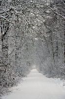 Besneeuwd bos van Boswachterij Ruinen. Door vroeg op pad te gaan ontwijk ik storende afdrukken van wandelende mensen in de sneeuw en is het sneeuw nog vers en niet weg gesmolten door de zon.