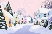 Details: winterlandschap, kerstsfeer, sneeuw, huizen, kerstdecoraties, roze hemel, sneeuwvlokken, feestdagen,…