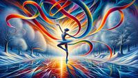 De dertiende afbeelding voert ons mee naar een winters droomlandschap waarin een danseres op één been balanceert, begeleid door elegante, kleurrijke linten die zich een weg banen door de koude, besneeuwde omgeving. Haar beweging lijkt de ijzige stilte van de winter te doorbreken door warmte en kleur in het landschap te brengen. De…