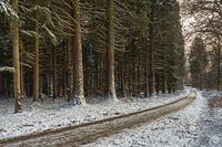 Lichte sneeuwval heeft het bos bedekt met sequoia's aan de linkerkant