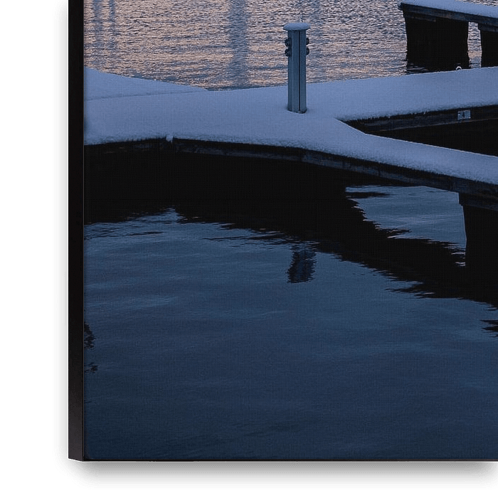 Stille ligplaatsen bedekt met verse sneeuw tekenen grafische lijnen boven diepblauw water. Aan de horizon gloeien oranje schemerkleuren onder dramatische wolken en een stadsrand. Rust, minimalisme en noordelijke sfeer maken…