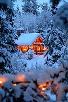 Een dromerig winterlandschap ontvouwt zich als zachte sneeuw de bomen omhult en een gezellig houten huis gloeit in warm licht. De gezelligheid van het winterverblijf straalt een gevoel van vrede en rust uit. Deze foto is perfect voor de woonkamer om warme herinneringen en een uitnodigende sfeer te creëren.
