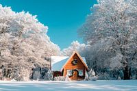 Een betoverend winterparadijs waar zachte sneeuwvlokken het landschap omhullen. De charmante houten gevel straalt warmte uit, terwijl de heldere hemel stralend blauw is. Dit beeld ontvouwt zijn heel speciale magie in de woonkamer, waar het gezelligheid en de vreugde van koude dagen belichaamt. Ideaal voor een uitnodigende sfeer!