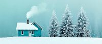 Een helderblauw huis trotseert het winterse grijs, terwijl rook zachtjes opstijgt uit de schoorsteen. Omringd door besneeuwde dennenbomen straalt het tafereel gezelligheid en rust uit. Deze foto is perfect voor de woonkamer en nodigt je uit om herinneringen op te halen aan gezellige winteravonden en een warme sfeer te creëren.