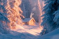 Een idyllisch wintersprookje ontvouwt zich, met zachte sneeuwvlokken die op het besneeuwde landschap vallen. Het warm verlichte huisje straalt gezelligheid uit, omringd door torenhoge, besneeuwde bomen. Dit beeld is perfect voor de woonkamer, waar het een warme, uitnodigende sfeer creëert en aanzet tot dagdromen.
