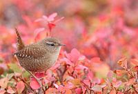 Winterkoning (Troglodytes troglodytes) in Finland. Zittend op een roze gekleurde struik in het najaar.