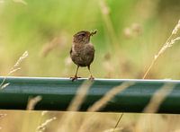 Dit winterkoninkje is op jacht geweest en nu onderweg om het jong te gaan voeren. Ze zitten veel tussen de struiken. Lekker beschut.