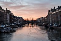 Winterse zonsondergang op een halfbevroren Nieuwe Gracht in Haarlem