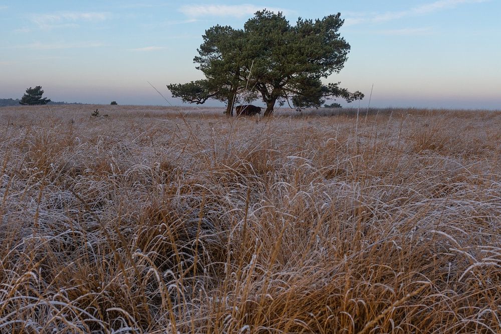 Winterlandschap op de Posbank op een koude dag. Heide en bomen zitten vol rijp wat prachtige taferelen oplevert op Nationaal park de Veluwe