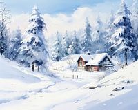 Winterlandschap Schilderij - Het werk toont een idyllisch winterlandschap met besneeuwde dennen en een charmant huisje, allen gevat in zachte penselen van blauw en wit waardoor een frisse, serene sfeer ontstaat. Het gebruikte kleurenpalet en de luchtige penseelstreken geven het geheel een dromerige, bijna impressionistische…