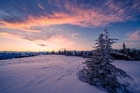 De foto van deze zonsondergang is gemaakt op de top van de uitzichtberg Rossbrand, op de grens tussen Radstadt en Filzmoos in het SalzburgerLand. De zon verdwijnt net achter de horizon en kleurt het hele landschap in een diep oranje en blauwe kleur.