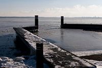 reflectie van de zon op het bevroren oppervlak van een meer in de winter et sliet van een stad op de achtergrond.