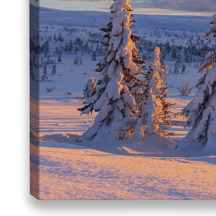 Een beeld van een landschap in de winter. Er staan naaldbomen op een plateau, die bedekt zijn met een dikke laag sneeuw. Er zijn veel kleine wolkjes en de late namiddag zon schijnt hier van onderen tegen aan. Het landschap heeft een gouden kleur.