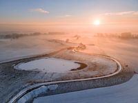 Ik had super veel geluk op deze ochtend, heel lokaal was er een paar centimeter sneeuw blijven liggen en tegelijkertijd rolden er mistbanken over het winterlandschap. Daarbovenop was er ook nog een prachtige zonsopgang. Kortom, geweldige omstandigheden voor een foto. In deze foto heb ik de drone gebruikt om een kronkelende dijk door het landschap van boven te fotograferen.
