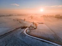 Ik had super veel geluk op deze ochtend, heel lokaal was er een paar centimeter sneeuw blijven liggen en tegelijkertijd rolden er mistbanken over het winterlandschap. Daarbovenop was er ook nog een prachtige zonsopgang. Kortom, geweldige omstandigheden voor een foto. In deze foto heb ik de drone gebruikt om een kronkelende dijk door het landschap van boven te fotograferen.