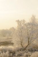 Winterlandschap in de delta van de IJssel bij Kampen, Nederland. De bomen en het riet zijn bedekt met vorst tijdens deze koude winterzonsopgang. Kampen is een oude Hanzestad in Overijssel, Nederland.