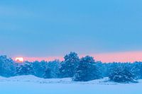 Sneeuwwinterlandschap in het stuifduingebied Hulshorsterzand in het natuurgebied de Veluwe in Gelderland, Nederland tijdens een koude winterse zonsondergang.