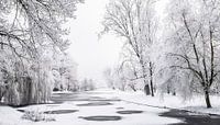 Bevroren winterlandschap in het stadspark van Kampen in Nederland. De vijver is bevroren en er hangt vorst aan de bomen.
