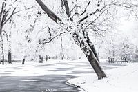 Bevroren winterlandschap in het stadspark van Kampen in Nederland. De vijver is bevroren en er hangt vorst aan de bomen.