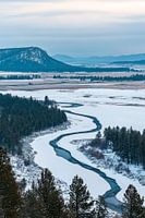 Er ontvouwt zich een betoverend winterpanorama met glooiende, besneeuwde heuvels en een meanderende rivier die door het ijzige bos stroomt. De rustige, koele kleuren creëren een ontspannen sfeer, perfect voor een woonkamer waar je je wilt terugtrekken na een lange dag. Een harmonieus beeld dat de natuur tot leven brengt.