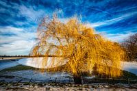 Winterlandschap met boom en sneeuw en wolkenpartij aan de Rijn bij Düsseldorf