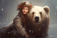 Winterlandschap met sneeuw met daarin een beer en een meisje. Een fantasierijk werk over de vriendschap tussen een beer en een meisje in de sneeuw. Door de takjes hulst in de muts van het meisje krijgt dit werk een kerst uitstraling.