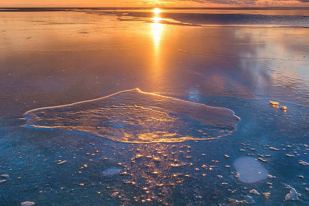 Winterlandschap met ijs op het IJsselmeer bij Workum tijdens zonsondergang met een warme winterzon en sneeuw wolken in de lucht