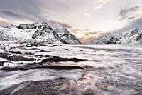 Kustlandschap in de winter met waterbeweging over grote stenen, op de achtergrond een bergketen met sneeuw, contrasterende lucht met kleuren bij zonsopgang - Ligging: Noorwegen, Lofoten