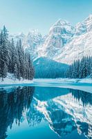 Een majestueus winterpanorama ontvouwt zich waar besneeuwde bergen worden weerspiegeld in kristalhelder water. De rustige compositie van zachte blauwe tinten en nonchalant staande dennenbomen creëert een sfeer van ontspanning en sereniteit. Perfect voor de woonkamer om een vleugje natuur en rust in de kamer te brengen.