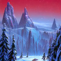 Dit winterlandschap is een prachtige weergave van de koude, besneeuwde bergen en het dichte bos. Het gloeiende statische sneeuweffect versterkt de scène, evenals de rode lucht.
