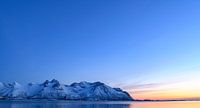 Besneeuwd winterlandschap tijdens de zonsondergang aan de kust van het Austvågøy-eiland van de Lofoten-archipel in Noord-Noorwegen De bergen zijn bedekt met sneeuw. Lang belichtingsbeeld.