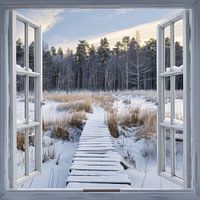 Dompel jezelf onder in de vredige schoonheid van een besneeuwd winterlandschap, vastgelegd door een open raam. De ongerepte sneeuwdeken en helderblauwe lucht creëren een rustgevende sfeer die perfect is voor elke kamer. Deze scène is ideaal voor natuur- en winterliefhebbers en brengt een verfrissende en contemplatieve sfeer in je…