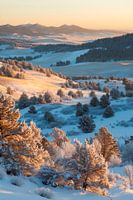 De glooiende heuvels en majestueuze bergen, zachtjes gehuld in gouden licht, creëren een vredig winterlandschap. De glinsterende, besneeuwde bomen en de heldere, frisse lucht nodigen je uit om te dromen. Dit schilderij is ideaal voor de woonkamer, geeft de kamer een rustgevende sfeer en roept herinneringen op aan winterwandelingen op het platteland.
