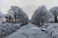 Winter in januari 2017. Een sprookjesachtig landschap in de provincie Drenthe (Nederland). Na een koude nacht vroeg in de ochtend vlak voor zonsopkomst. Nog even kunnen genieten voordat het ijs van de takken weer ging smelten.