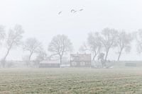 Winterlandschap in Dordrecht, Nederland. Een sfeervolle, dromerige opname met sneeuw, mist en vorst in de winter. In de lucht een paar ganzen. Langs de Zeedijk een huis en bomen.