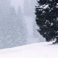 Een persoon loopt door het bos in een sneeuwstorm