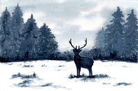 Deze aquarel is geschilderd met slechts één kleur, indigoblauw, en toont het silhouet van een hert voor een open plek in het bos.