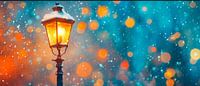 Een warm gloeiende lantaarnpaal contrasteert met zachte, besneeuwde vlokken en levendige, kleurrijke lichtjes. De harmonieuze mix van kou en warmte nodigt uit om te dromen. Dit betoverende beeld geeft de woonkamer een uitnodigende sfeer, perfect voor ontspannende winteravonden en nostalgische momenten.