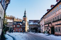 Deze foto toont het centrale plein van Stolberg op een heldere winterdag. De historische vakwerkhuizen en het markante raadhuis met zijn toren bepalen het beeld en geven het plein een duidelijke structuur. Sneeuw ligt op daken, stoepen en de straat, deels samengedrukt en deels onaangeroerd, wat meteen duidelijk maakt dat het koud is.…