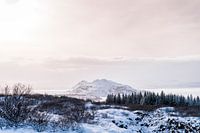 Deze prachtige winterfoto vangt een met sneeuw bedekte vallei verlicht door het zachte, gouden licht van een lage zon. Een eenzame heuvel omringd door sparrenbossen en kale struiken voegt diepte toe aan de serene scène. De delicate pastelkleuren in de lucht contrasteren subtiel met het koele wit van de sneeuw, wat een harmonieus en rustgevend beeld creëert. Dit kunstwerk is perfect voor liefhebbers van landschappen die een gevoel van kalmte en natuurlijke schoonheid oproepen.