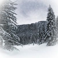 Die idyllische bayrische Hemmersuppenalm liegt oberhalb von Reit im Winkl auf rund 1250 m. Winterwanderwege und Langlaufloipen laden zum Erkunden ein. Der zertifizierte Premium-Winterwanderweg führt durch herrliche Landschaften, zu wunderschönen Ausblicken und Berghütten. Durch die einzigartige Interpretation der Künstlerin wirkt das Motiv märchenhaft. Erleben Sie einen Winterzauber im Schneegestöber.