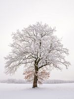 IJzige vorst bedekt een eenzame boom in Beieren, Duitsland