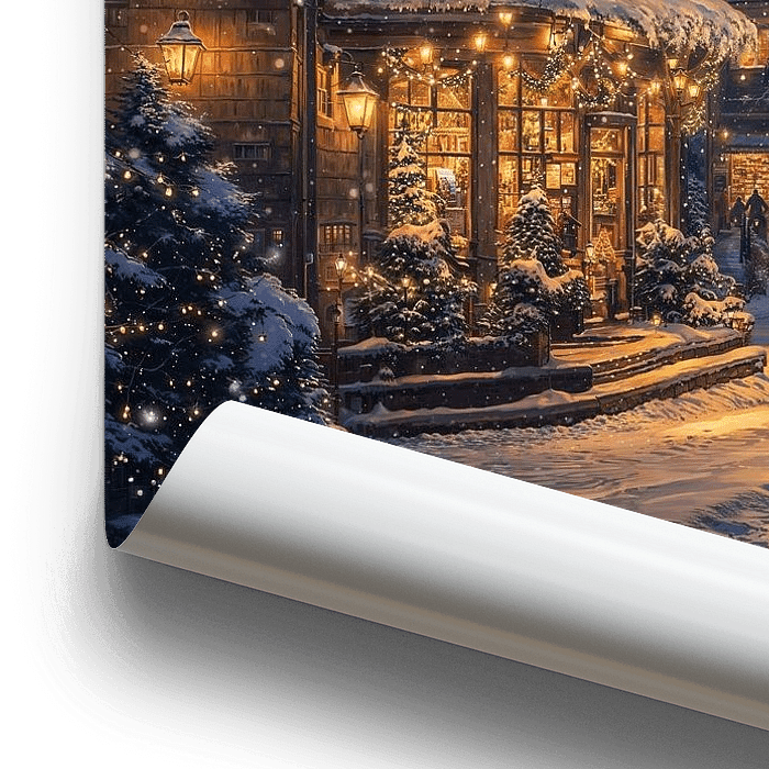 Een magisch winterlandschap komt tot leven, met feestelijk verlichte huizen die glinsteren in de zachte gloed van sneeuwvlokken. Gezinnen dartelen vrolijk op de besneeuwde straat, terwijl een nostalgische sfeer alles omhult. Deze sfeervolle afbeelding voegt een vleugje warmte en feestelijke magie toe aan elke muur in de woonkamer.