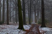 Mistig beukenbos in hartje winter. Koninklijk landgoed de Horsten in Wassenaar, Zuid Holland. Beetje sneeuw, sfeervol bospad. Romantisch.