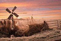 Mooie oranje / roze lucht tijdens zonsopkomst in de winter met vorst, ergens midden in de polder met molentje