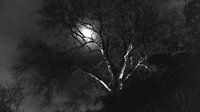 Een kale boom in de koude winternacht. De hemel is bewolkt en een vale maan schijnt door de dunne bewolking. Verlichting schijnt van onderen op de kale takken. De foto is in zwartwit. Je bent liever binnen, waar het warm en licht is.