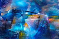 Heldere vormen en kleuren doen denken aan IJsland met zijn turkooizen ijsbergen. Helder blauw omgeven door warm licht in oranje en magenta, een nacht in de winter. Levendige structuren, vol van licht en leven. Een beeld vol energie, kracht en sterkte in een positieve stemming.