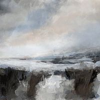 Landschap in neutraal bruin, grijs, blauw en wit.