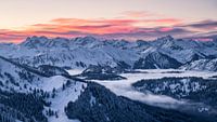 Ochtendgloren over winterse, besneeuwde bergen. In de vallei waait de mist. Uitzicht op de Allgäuer Hochalpen bij Oberstdorf.